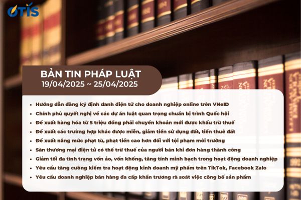 OTIS LAWYERS xin gửi đến bạn đọc bản tin pháp luật 19/04/2025 ~ 25/04/2025. Những chính sách mới, những cập nhật về tình hình kinh tế – xã hội nói chung. Và thông tin về lĩnh vực pháp luật nói riêng sẽ được chúng tôi tổng hợp trong bản tin pháp 19/04/2025 ~ 25/04/2025 dưới đây.