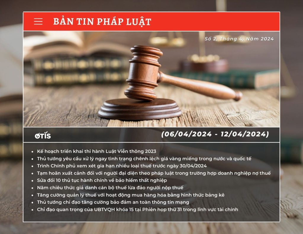 OTIS LAWYERS xin gửi đến bạn đọc bản tin pháp luật 6/4 – 12/4. Tức tuần thứ của tháng 04/2024. Những chính sách mới, những cập nhật về tình hình kinh tế – xã hội nói chung. Và thông tin về lĩnh vực pháp luật nói riêng sẽ được chúng tôi tổng hợp. Trong bản tin pháp luật 6/4 – 12/4 dưới đây.