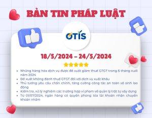 OTIS LAWYERS xin gửi đến bạn đọc bản tin pháp luật 18/5 – 24/5. Tức tuần thứ 4 của tháng 05/2024. Những chính sách mới, những cập nhật về tình hình kinh tế – xã...