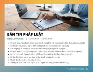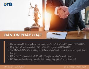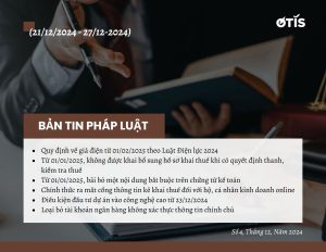 OTIS LAWYERS xin gửi đến bạn đọc bản tin pháp luật 28/12/2024 – 3/1/2025. Tức tuần thứ 1 của tháng 01/2025. Những chính sách mới, những cập nhật về tình hình kinh tế – xã...