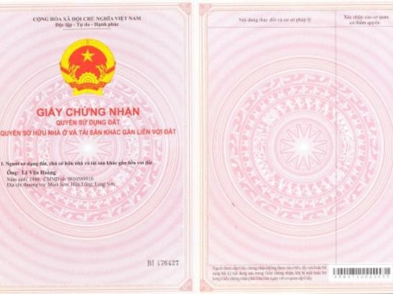 Trang 1: Quốc hiệu, tiêu ngữ và dòng chữ “Giấy chứng nhận quyền sử dụng đất, quyền sở hữu nhà ở và tài sản khác gắn liền với đất” in màu đỏ; mục “I. Tên người sử dụng đất, chủ sở hữu nhà ở và tài sản khác gắn liền với đất” và số phát hành Giấy chứng nhận (số seri) gồm 02 chữ cái tiếng Việt và 06 chữ số, được in màu đen; dấu nổi của Bộ Tài nguyên và Môi trường;