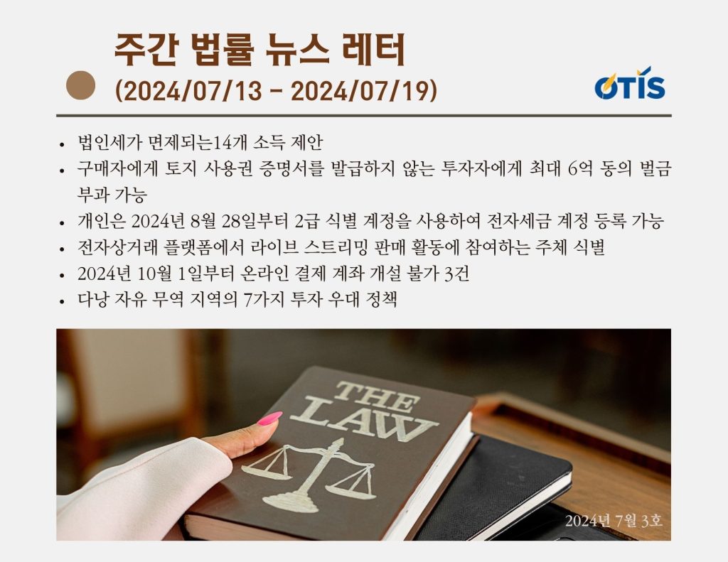 주간 법률 뉴스 레터 (2024/7/13 ~ 7/19): 법인세가 면제되는14개 소득 제안