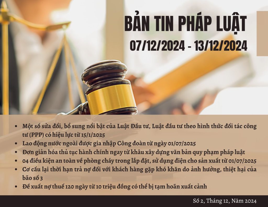 BẢN TIN PHÁP LUẬT (TUẦN 07/12/2024 ~ 13/12/2024): LAO ĐỘNG NƯỚC NGOÀI ĐƯỢC GIA NHẬP CÔNG ĐOÀN TỪ 01/07/2024