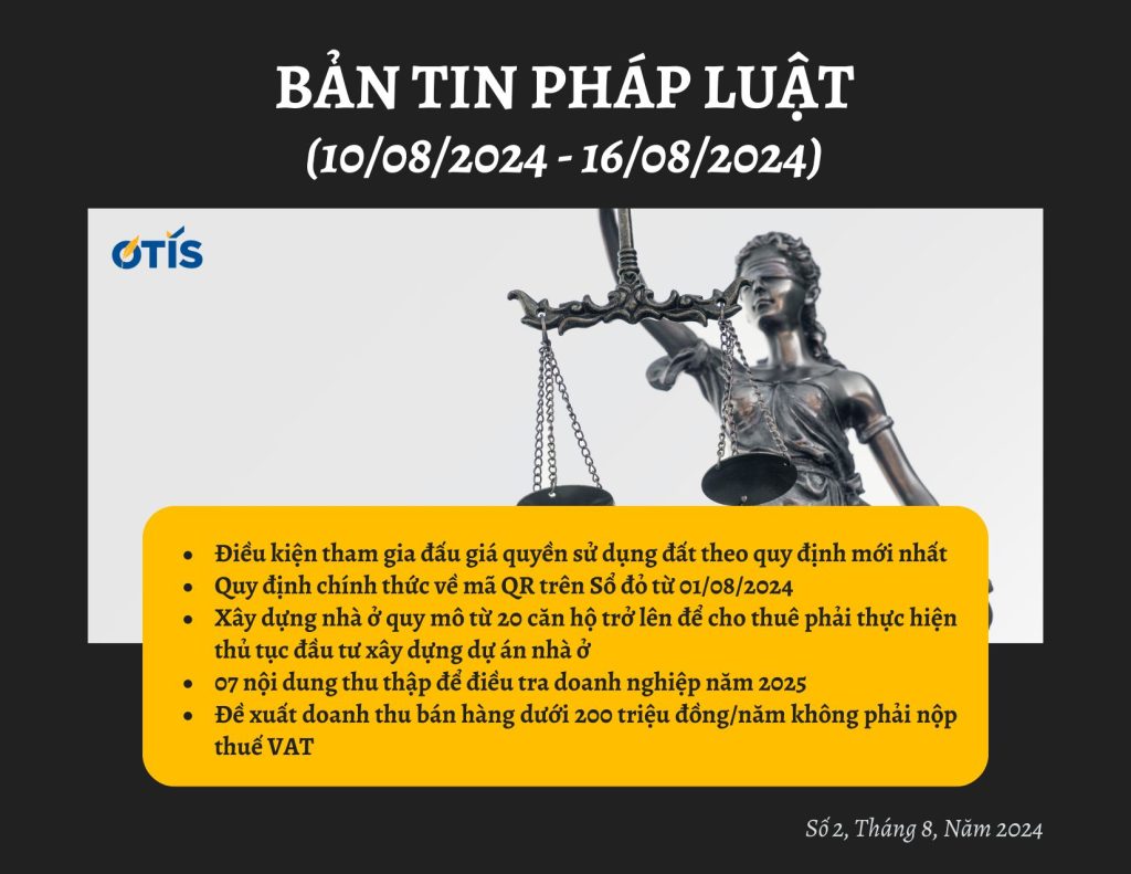 OTIS LAWYERS xin gửi đến bạn đọc bản tin pháp luật 10/8 – 16/8 . Tức tuần thứ 2 của tháng 08/2024. Những chính sách mới, những cập nhật về tình hình kinh tế – xã hội nói chung. Và thông tin về lĩnh vực pháp luật nói riêng sẽ được chúng tôi tổng hợp trong bản tin pháp luật 10/8 – 16/8 dưới đây.