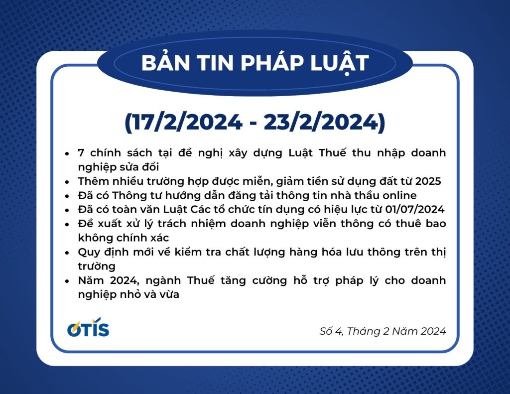 OTIS LAWYERS xin gửi đến bạn đọc bản tin pháp luật 17/2 – 23/2. Tức tuần thứ 4 của tháng 02/2024. Những chính sách mới, những cập nhật về tình hình kinh tế – xã hội nói chung. Và thông tin về lĩnh vực pháp luật nói riêng sẽ được chúng tôi tổng hợp. Trong bản tin pháp luật 17/2 – 23/2 dưới đây.