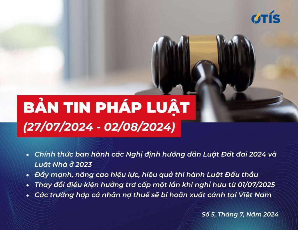 OTIS LAWYERS xin gửi đến bạn đọc bản tin pháp luật 27/7 – 2/8. Tức tuần thứ 5 của tháng 07/2024. Những chính sách mới, những cập nhật về tình hình kinh tế – xã hội nói chung. Và thông tin về lĩnh vực pháp luật nói riêng sẽ được chúng tôi tổng hợp trong bản tin pháp luật 27/7 – 2/8dưới đây.